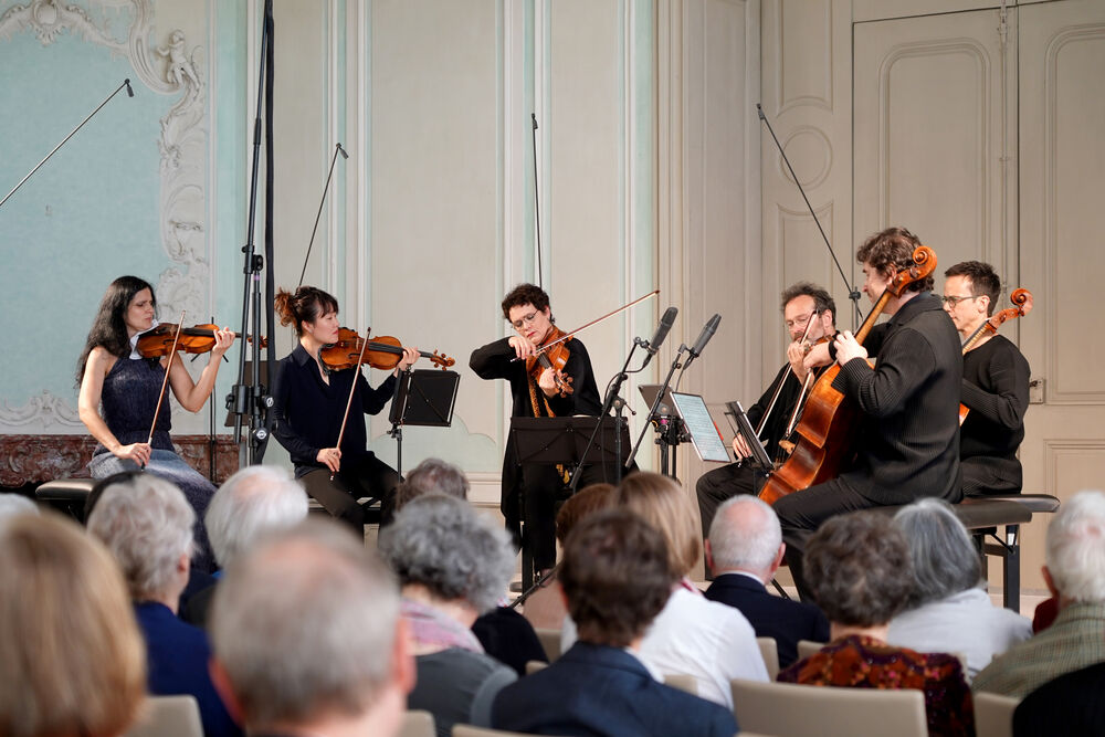 Nach der Schussformel steht der letzte Ton kurz im Raum, dann bricht Applaus los. Pause. In der zweiten Konzerthälfte kommt das zweite Streichsextett von Brahms. Stücke verschiedenster Gattungen komponierte Brahms in Paaren: seine ersten beiden Symphonien, die Klavier- und Streichquartette und auch seine beiden Streichsextette. Deshalb gibt es auch Gemeinsamkeiten zwischen seinem ersten und zweiten Sextett – beide fallen in einen Zeitraum privater Umbrüche. Bekannt ist Brahms Verlobung mit Agathe von Siebold, der Tochter eines Professors aus Göttingen. Diese löste er 1859 auf. Ebenso prominent übersetzt er im ersten Satz seines Streichsextetts Nr. 2 in G-Dur ihren Namen in Notenschrift. Das Motiv A-G-A-H-E erklingt nach der Vorstellung der beiden Hauptthemen. Markant klingt dieses Motiv auch in Schwetzingen – stark arbeitet es vor allem Suyeon Kang an der Geige heraus. Zu Beginn ist nur ein zerbrechlicher Klangteppich zu hören, aus dem sich dann die Themen entwickeln – meisterlich umgesetzt von den Musikern.